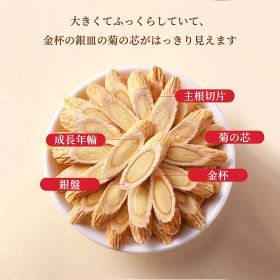 野生特級の黄耆の主根を選んで、頭尾を取り除いて、黄耆の有効成分の甲苷の含有量が流失しないことを確保して、片型は均しています。人工的に選んで、黒い片、小さい片、劣悪な片を取り除いて、金盏の銀盤の菊の心の標準の黄耆の片だけを保留します。