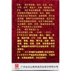 【成分・分量】 天麻、白止、何首烏、熟地黄、丹参、川窮、当帰、カリン、白芍など。