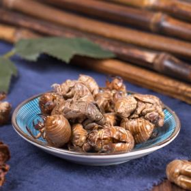 名医別録に収載。セミ科 Cicodidae スジアカクマゼミ Cryptotympana atrata Fabr. の蛹の脱皮した殻(ぬけがら)。